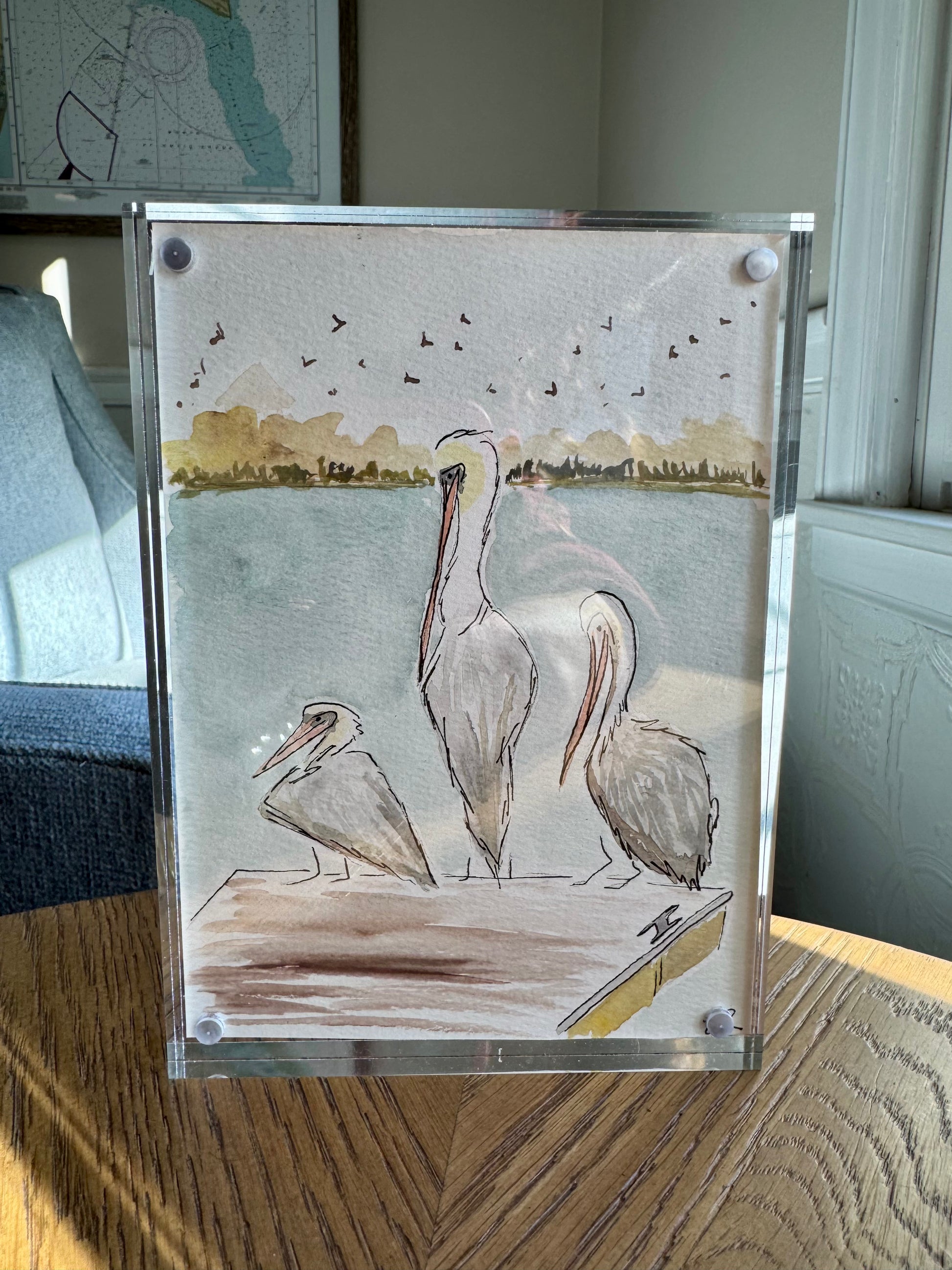 Three Pelicans – Original 5×7 Watercolor (Framed)